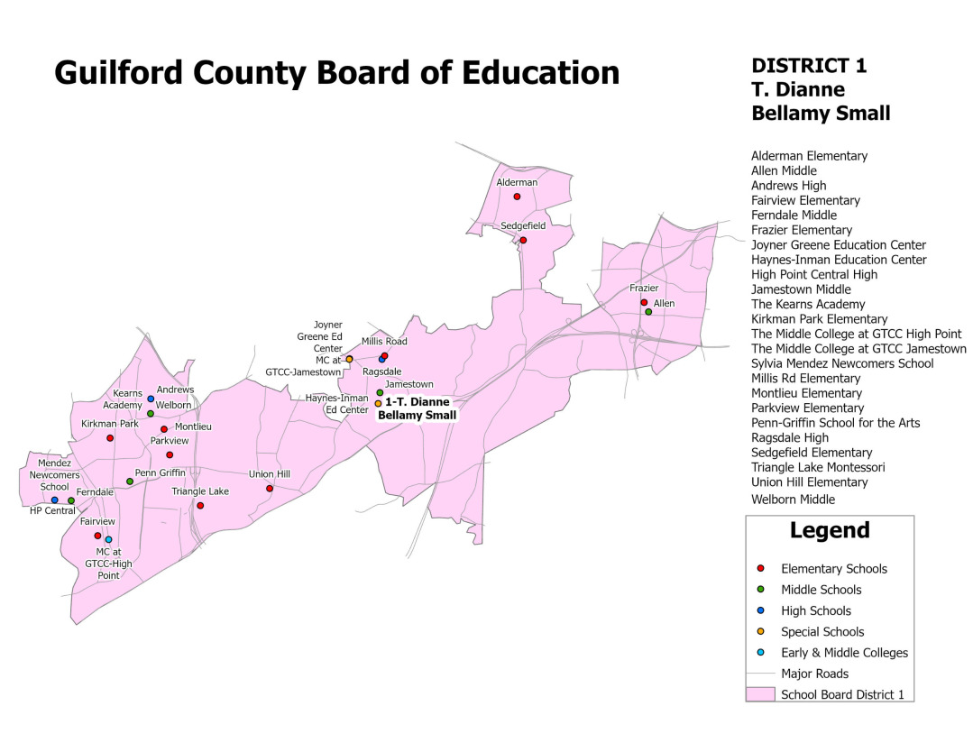Alderman Elementary, Allen Middle, Andrews High, Fairview Elementary, Ferndale Middle, Frazier Elementary, Greene Education Center, Haynes-Inman Education Center, High Point Central High, Jamestown Middle, Kearns Academy, Kirkman Park Elementary, The Middle College at GTCC-High Point, The Middle College at GTCC-Jamestown, Sylvia Mendez Newcomers School, Millis Road Elementary, Montlieu Elementary, Parkview Elementary, Penn-Griffin School for the Arts, Ragsdale High, Sedgefield Elementary, Triangle Lake Montessori, Union Hill Elementary and Welborn Middle.